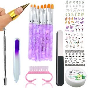 7PC Acrylic Nail Art Tips Builder Painting Brushes Pen Set,1PC Nail File Cuticle Pusher Buffer Block Brush,100Pcs Nail Extension Forms,1 Box Nail Decorations Charms 4 Sheets Nail Stickers