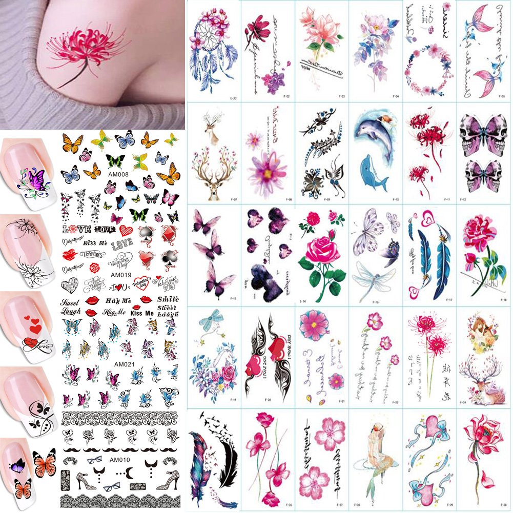 This tattoo set contains 30 sheet tattoo stickers and 4 sheet nail decals